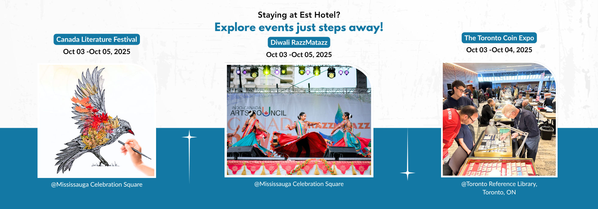 Toronto and the GTA come alive every fall with vibrant festivals, cultural showcases, and unique experiences. If you’re planning to visit the city in early October, three standout events promise excitement, learning, and unforgettable memories: Canada Literature Festival, Diwali RazzMatazz, and The Toronto Coin Expo. All happening from October 3–5, 2025, these events bring together the best of literature, culture, tradition, and collectibles. And the best part? You can experience them all while staying at EST Hotel, located near Toronto Pearson International Airport (YYZ).