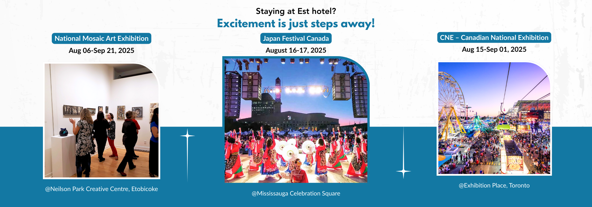 EST Hotel’s Etobicoke location means you’re strategically placed between all three event venues. You can reach the Neilson Park Creative Centre for the art exhibition in just a few minutes. Enjoy a quick ride to Mississauga Celebration Square for the Japan Festival. You are also a short drive from Exhibition Place for the CNE. That means more time soaking up the excitement and less time stuck in traffic.